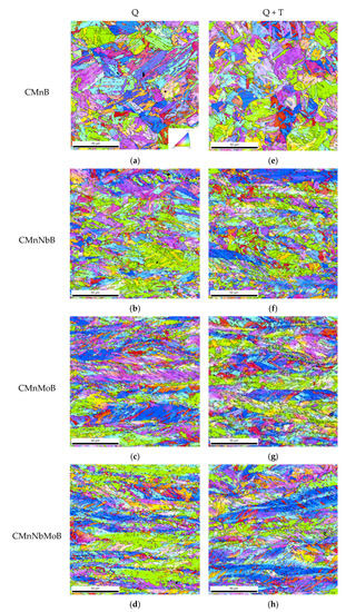 Besides the qualitative characterization by means of conventional observation techniques, a quantitative crystallographic characterization was carried out using EBSD technique. In Figure 4 the IPF (Inverse Pole Figure) maps corresponding to the different steels and both Q and Q + T states are presented. Regarding the effect of chemistry, the addition of microalloying elements promotes microstructural refinement. The coarsest martensitic structure is observed in the CMnB grade before and after tempering (see Figure 4a,e). The formation of a very fine martensitic microstructure is observed in the Mo containing steels (Figure 4c,d,g,h). Moreover, the EBSD maps corresponding to Mo and NbMo micro-alloyed steels show that the transformation takes place from a heavily deformed austenitic structure, as the prior austenite pancaked structure is clearly reflected. In order to confirm this fact, samples were etched by picric acid and completely different austenite conditioning could be identified depending on the chemical composition as shown in a previous study [22]. In the CMnB steel, an equiaxed and homogeneous austenite grain structure is observed. For the CMnNbB steel, a mixed structure consisting of pancaked and dynamically recrystallized fine grains is found. The Mo containing grades comprise a fully pancaked austenite microstructure showing a high degree of strain accumulation [22]. Tempering of the CMnB steel modifies the microstructure to slightly coarser grain size as compared to the quenched state (Figure 4a,e). On the contrary, the microstructure of the micro-alloyed steels appears not to be altered by the tempering treatment (see Figure 4). This can be related to the well-known potency of Mo and Nb of strongly obstructing recrystallization at temperatures below 650 °C.