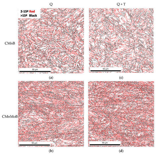 In Figure 5, the grain boundary maps related to (a,c) CMnB and (b,d) CMnMoB steels are shown. Low angle boundaries, between 2 and 15° are drawn in red, whereas the high angle boundaries, higher than 15° are represented in black. The influence of adding Mo is evidently reflected in Figure 5. Significantly finer microstructures are being achieved when Mo is added, considering both misorientation criteria. Additionally, Mo alloying augments the low angle boundary density (drawn in red), in the quenched steel and retains it even during tempering (Figure 5b,d). On the contrary, tempering of the CMnB steel evidently results in a significant reduction of the low angle boundary density (Figure 5a,c). Additionally, a slight coarsening of the microstructure for the CMnB steel is observed during the heat treatment.