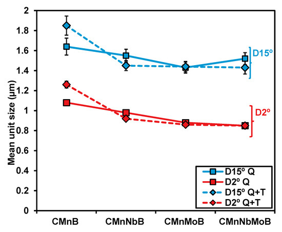 The unit sizes were quantitatively determined from these EBSD scans in both, Q and Q + T states, for all steel grades. For quantifying the mean grain size, different misorientation criteria were considered, measuring the unit sizes with low and high tolerance angles. The effective grain size was calculated as the equivalent circle diameter corresponding to the individual grain area. In Figure 6, the mean grain size considering low and high angle misorientation criteria (boundaries between 2° and 15° and boundaries higher than 15°, respectively) are plotted for Q and Q + T states. Regarding the evolution of 2° mean unit size, for both Q and Q + T samples, slightly finer D2° are achieved when microalloying elements are added. Considering the high angle boundary misorientation criteria, a similar trend is detected. The addition of microalloying elements causes a reduction of mean unit sizes, and largely prevents coarsening by the tempering treatment. Such coarsening, however, occurs in the CMnB steel where D2° increases from 1.08 in the quenched state to 1.26 µm after tempering. The NbMo steel comprises the smallest D2° unit size of around 0.87 µm in Q as well as Q + T condition.