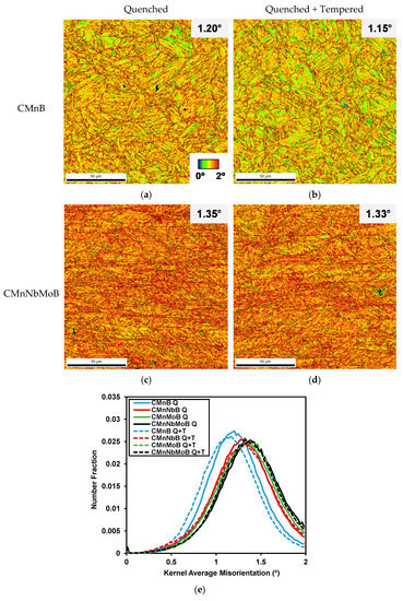 Analyzing the effect of tempering treatment, different behavior is noticed depending on the chemical composition. In the CMnB steel, slightly different KAM maps are observed when Q and Q + T states are compared (see Figure 7a,b). For the CMnNbMoB though, KAM parameter remains unmodified. Similar average KAM values are measured before and after heat treatment (see Figure 7c,d, KAM values of approximately 1.3°). For CMnNbB steel, similar KAM values are quantified for both conditions (of 1.28°), while for CMnMoB grade, KAM values of 1.30° and 1.34° are measured, for Q and Q + T, respectively. Besides the average value, the effect of tempering on the KAM distributions are plotted in Figure 7e for all the steels. No impact of tempering is observed on Kernel Average Misorientation distributions for the micro-alloyed steels (Nb, Mo, and Nb-Mo). In the CMnB grade meanwhile, the tempering treatment slightly shifts the KAM distribution to lower values. The Kernel map in the Q state presents more regions in red-orange colors and the Q + T image shows some blue-green areas (see Figure 7a,b).