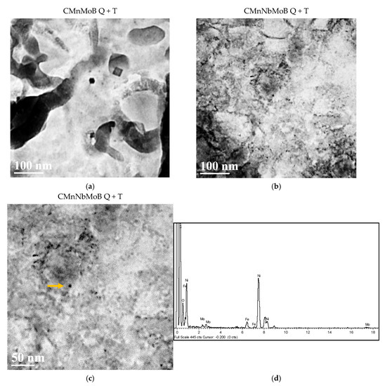 TEM micrographs corresponding to (a) CMnMoB and (b,c) CMnNbMoB grades and Q + T state (d) Microanalysis of the fine precipitate marked in (c) (the presence of Ni in the spectrum originates from the grid holding the carbon replica).