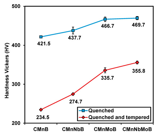 Figure 9 compares average Vickers hardness values obtained for each chemical composition before and after tempering treatment. Considering first the quenched condition, the CMnB steel comprises the lowest hardness as expected. The sole addition of Nb and Mo raises the hardness by 16.2 HV and 45.2 HV, respectively. However, combined alloying of Nb and Mo does not result in further significant hardness increase over the Mo-only addition. Tempering generally leads to a major loss of hardness. The hardness drop is largest in the CMnB steel amounting to 187 HV. The additions of Nb and Mo reduce the hardness loss to 163 HV and 131 HV, respectively. The combined addition of Mo and Nb further reduces the hardness loss to 114 HV. Accordingly, beyond the individual contributions of Nb and Mo to tempering resistance a significant synergetic effect is observed when both alloying elements are combined.