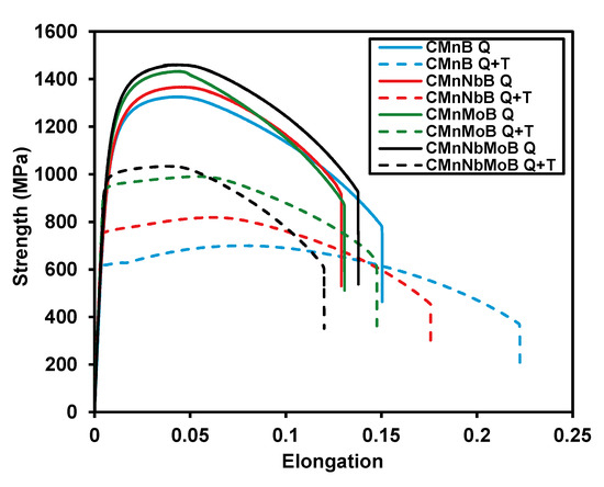 - Zurutuza, I.; Isasti, N.; Detemple, E.; Schwinn, V.; Mohrbacher, H.; Uranga, P. Effect of Thermomechanical Strategy and Mo-Nb-B Alloying Additions on High Strength Medium Carbon Q/Q&T Steels. In Proceedings of the Materials Science and Technology 2019 (MS&T19) Conference, Portland, OR, USA, 29 September–3 October 2019; pp. 1401–1408. [Google Scholar] [CrossRef]