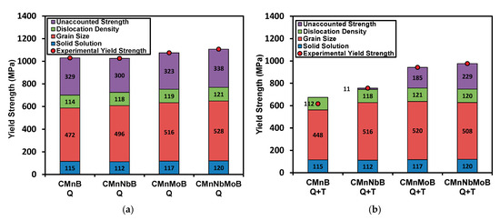 In Table 5 and Figure 12a,b, the values for the different strengthening mechanisms are shown for both Q and Q + T conditions, respectively. For verification, the experimental yield strength values obtained by tensile tests are represented by the red dots in the figure. Regarding the quenched state, similar contribution due to solid solution are estimated for all the steels. The results suggest that the most relevant strengthening mechanism is associated with the unit sizes. Contributions ranging from 472 to 528 MPa are quantified, for CMnB and CMnNbMoB steels, respectively. No significant effect on the hardening related to dislocation density is apparent from adding microalloying elements as this contribution only increases from 114 to 121 MPa at the most. The hardening due to carbon in solid solution is associated in the unaccounted strength (σus), as explained earlier. This contribution is calculated as the difference between experimental yield strength and the sum of all other contributions. Values higher than 300 MPa are quantified in all the cases for the unaccounted strength (σus). A similar procedure was also considered in other works [39].