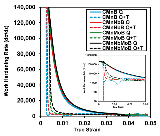 Finally, in order to find a reasonable correlation between the work hardening parameter and ductility of the material, the stress-strain behavior was analyzed using the Hollomon approach [44,45]. From the tensile curves shown in Figure 10, the work hardening rate was calculated before and after quenching. In Figure 14 the work hardening rate is plotted as a function of true strain for all the chemistries and both quenched as well as tempered samples. Initially, for both, the Q and Q + T states, the work hardening rate is relatively high and decreases drastically in the early stage of the deformation. In this region, work hardening of the quenched sample is significantly higher compared to the tempered sample. In the quenched steels, no significant effect of alloying is observed in the work hardening behavior while this is clearly the case in tempered condition (see Figure 14). The CMnB steel exposes Lüders deformation without work hardening immediately after dislocations have been unlocked. The steel alloyed with Nb and/or Mo, however, maintain work hardening in that strain range, be it at a much lower level than in quenched condition. The observed differences could be explained by an increasing population density of nano-precipitates in the CMnNbB towards the CMnNbMo containing steels. According to the Ashby–Orowan mechanism [46], mobile dislocations passing an array of precipitates produce Orowan loops enhancing dislocation density and reducing the mean-free particle interspace, thus generating work hardening. The back-stress of the dislocation loops can induce cracking of larger carbide particles and cause quicker progress of failure after passing homogeneous elongation. This is assumed to be the reason for the reduced post-uniform elongation, of the CMnMoB and especially the CMnNbMoB steels as mentioned earlier.
