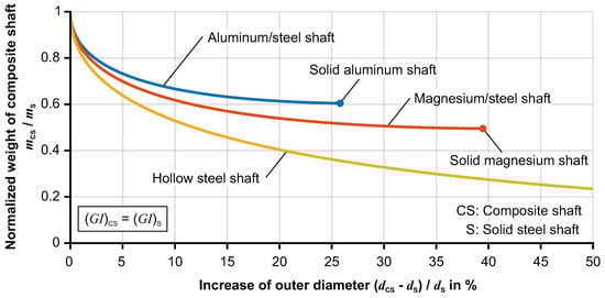 Mass savings for substituting a solid steel shaft by composite shafts with aluminum core, magnesium core and hollow shafts with identical torsional stiffness.