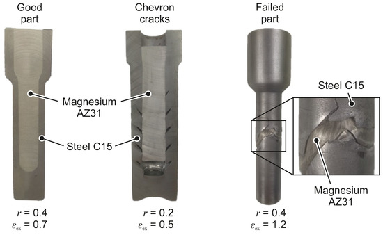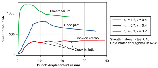 Figure 5 shows parts produced by forward cold extrusion of cold forged cups with inserted magnesium cores. Parts that do not show macroscopic defects at the outer surface are cut in half to examine the inner core. Two types of failure occur, which are cracks at the inner surface of the steel sheath and cracks along the whole thickness of the sheath. The former is present for small extrusion strains in combination with high cup wall thicknesses. The onset of each crack can also be observed in the process force, as shown in Figure 6, where each crack leaves a characteristic drop in the force-displacement curve. Periodic internal arrow-shaped cracks at the central axis, also called chevron cracks, are a common process failure in conventional forward rod extrusion with small extrusion strains. They can be often identified by the concave shape of the front face of the extruded shaft. These chevron cracks occur due to hydrostatic tensile stresses in the forming zone [15]. As shown in Figure 5, parts with internal cracks also feature a characteristic concave front face. However, the cracks do not initiate at the magnesium core, but at the inner surface of the steel sheath. It is observed that cavities in front and behind the core develop, which implies a relative motion between core and sheath, such that it acts like a moving mandrel. This prevents high tensile stresses from being transmitted to the magnesium core, which is why the core does not show any failure. As stress conditions for chevron cracks are absent at the edge region of an extruded shaft, composite shafts with high reduction ratio in backward can extrusion, meaning low wall thicknesses, do not show any chevron cracks.