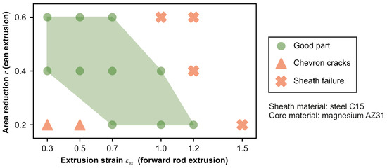 The complete process window for magnesium-steel composite forward rod extrusion is depicted in Figure 7. It is shown that the process is applicable for a wide range of parameter combinations. The hydrostatic pressure in the forming zone for high extrusion strains allows to form the magnesium core to strains of up to = 1.2. As failure only occurs in the steel sheath, the process is not limited by the low forming limit of magnesium at room temperature.
