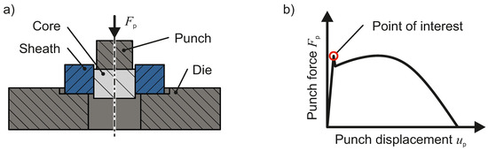 To asses the bond strength between magnesium cores and the steel sheath, push-out tests are conducted. A 5 mm thick disc is extracted from the area of homogeneous plastic strains of the cold forged composite shaft. During the push-out test, the outer ring of the specimen is supported by a die, while a punch pushes the core out of the specimen, as depicted in Figure 8. The punch force and displacement are recorded on a Zwick Z250 universal testing machine. The force-displacement-curves exhibit a distinctive peak at the time of initial slip of the core. The force at this point is used for evaluation of the bond strength, given by