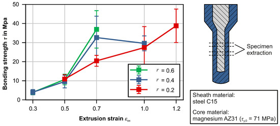 Figure 9 shows the bond strengths obtained by means of push-out tests of the successfully produced shaft geometries. The bond strength increases for higher extrusion strains. For the extrusion strain of 0.7 higher reduction ratios lead to an increase in bond strength, which is not observed for the other extrusion strains. An increase of bond strength for thinner sheath thicknesses is beneficial as regions of the shaft closer to the edge encounter higher stress under bending and torsion during service life. However, the achieved bond strengths are low compared to the initial shear yield stress of the magnesium core of = 71 MPa, which was determined by upsetting tests and application of the Tresca yield criterion. A micro form fit that Ossenkemper et al. established for aluminium cores [10] cannot be achieved for magnesium cores. This can be traced back to magnesium’s lower formability, preventing the core material to flow into the micro indents induced by sandblasting, which was validated by light-microscopy investigations. This is especially the case for low extrusion strains, where the lowest bond strength is observed.