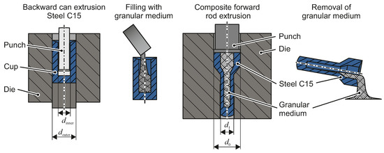 In order to produce hollow shafts by means of composite cold forging, a steel cup is filled with a granular medium and subsequently formed by means of forward rod extrusion, as shown in Figure 10. The granular medium prevents the cup from upsetting during forward extrusion. After forming, the core is removed to obtain the hollow part.