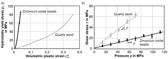 Yield stresses of quartz sand and zirconium oxide beads for (a) volumetric compression and (b) under shear loading, according to [20].