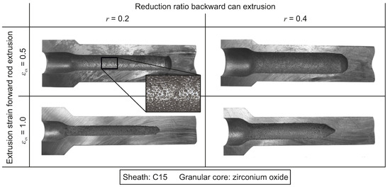 The cracks at the inner surface stem at the one hand from the pre-strained material, as they are not observed when using drilled steel cans for the same parameter combinations [18]. Especially the material at the inner surface of the cups exhibits the highest amount of strain hardening during backward can extrusion as shown in the process simulation (Figure 15). At the other hand, also the material behaviour of the granular core plays an important role, as no defects are observed when using zirconium oxide as a core material. As presented in Section 4.2, quartz sand has a higher shear yield limit than zirconium oxide beads, and thus transmits higher loads in axial direction to the steel sheath. As hydrostatic tensile stresses are highest at the centre of the workpiece during forward rod extrusion, the defects only occur for higher wall thicknesses.