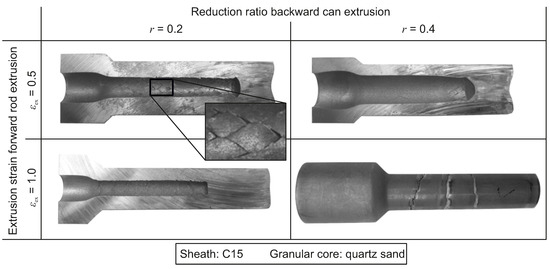 Figure 14 shows the shafts that were produced utilizing quartz sand as core material. It is observed that the parameter combination with the highest reduction ratio and extrusion strain results in macroscopic failure of the steel sheath. Furthermore, the inner surface of the shaft with = 0.5 and r = 0.2 shows arrow-shaped crack initiations. This is also the case for the shaft with = 0.5 and r = 0.4 at the region close to the bottom where the wall thickness is slightly higher.