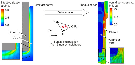 Due to different demands to the FEM-code, different solvers are used for backward can extrusion and composite forward rod extrusion. The former exhibits large plastic strains, resulting in unacceptable element distortion. Thus the process is modelled using Simufact Forming, as it provides a robust automatic re-meshing algorithm. Composite forward rod extrusion is modelled using the implicit Abaqus solver instead, as it features an implementation of a Drucker-Prager model with an additional cap yield surface, which is suitable for modelling granular media. To transfer plastic strains and residual stresses from the first process simulation to the second, a Python script is used. As the second process simulation requires a finer mesh to obtain convergent results, an additional mapping of the transferred data onto the new mesh is required. A spatial interpolation from the three nearest neighbor data points is applied (Figure 15).
