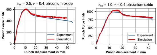 Punch force measured in experiments and obtained from simulation of forward rod extrusion with zirconium oxide core.