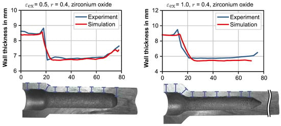 The wall thicknesses of the produced shafts are measured at the cut open specimens perpendicular to the outer surface of the hollow shafts. In simulations, corresponding node distances are measured. As shown in Figure 17, experiment and and simulation are in good agreement.