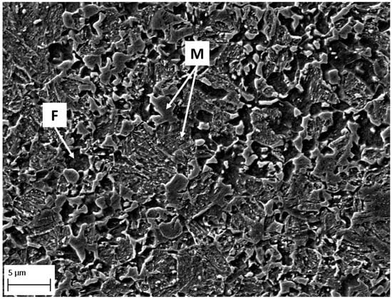 Microstructure of DP1000 from SEM after etching; F—ferrite, M—martensite.