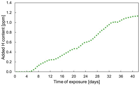 Content of the added diffusible hydrogen in a specimen with chloride deposits exposed to humid air was monitored using HERS. During first 2 days, the specimen was exposed to dry conditions at 4% RH to get stable signal reading. Then, the relative humidity was increased to 85% and maintained constant until end of the experiment. Figure 3 shows evolution of the hydrogen content with time of exposure from the start of the humid phase. Hydrogen content started to grow 5 days after introduction of humid air. This time lag can be attributed to the time needed for formation of rust layer and development of localized corrosion, as the process of hydrogen adsorption is related to the localized anodic sites underneath red rust [45]. The hydrogen content grew at a constant rate of 0.03–0.04 ppm·day−1. It started to stabilize after 33 days of exposure at about 1.1–1.2 ppm. Akiyama et al. [46] noticed that hydrogen content becomes independent of the exposure time after an initial increase. The plateau was observed after 60 8-h cycles of exposure in corrosive environment on samples with pre-deposited NaCl [36] or after 30 cycles of salt spray phases [47]. The plateau level of diffusible hydrogen measured with TDMS was about 0.06–0.08 ppm [36,47]. In the current work, static exposure conditions were chosen to maximize the hydrogen content in the sample. It can be assumed that cycling of the RH, typical for real atmospheric exposures, would lead to a lower hydrogen uptake into the investigated steel.