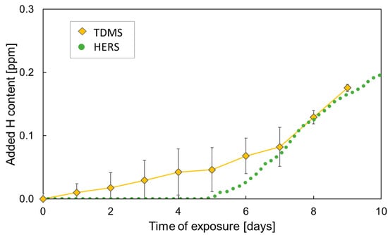 TDMS measurements were conducted on parallel corroded samples in order to confirm the HERS data. Added diffusible hydrogen contents measured by TDMS and HERS are compared in Figure 4 with error bars representing the standard deviation for the TDMS values. Although the data show a scatter between samples especially in the beginning of the exposure, the increase of hydrogen content becomes obvious after 5 days of exposure. The TDMS measurements show reasonably good correlation with HERS results for the same period of time considering natural differences in corrosion processes on parallel samples. Anyway, the data indicate somewhat lower sensitivity of the HERS technique at very low hydrogen concentrations. A new experiment aiming at comparison of longer-term TDMS and HERS data is in progress.