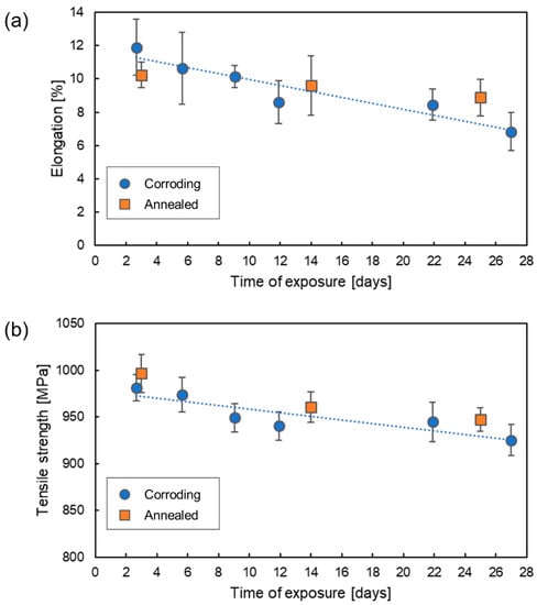 Sheng et al. [60] showed that a decrease of tensile strength is linked mainly to a cross-sectional area loss. They reported a 20% drop in ultimate load for samples with 19% cross-sectional area loss. In the current work, the cross-sectional area loss evaluated for the Corroding specimen exposed for 27 days (Figure 8) nearby the fracture region was 4%, whereas the tensile strength dropped by 6%. A somewhat higher cross-sectional area loss might be expected in the fracture region as fracture occurs in the region with the highest stress concentration presumably caused by intense pitting.