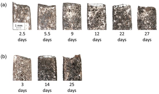 In order to investigate the possible effect of corrosion, cross-sections of the Corroding SSRT specimens were analyzed. The fractured SSRT specimens were cross-cut at the same distance from the specimen’s edge. The distance between the cross-cut and fracture was about 15–20 mm. Corrosion products were removed using inhibited hydrochloric acid. As examples, cross-sections of specimens exposed for 2.5 and 27 days are shown in Figure 8. Both photographs reveal localized corrosion. Several shallow pits were formed already after 2.5 days of exposure. The longer exposure to the corrosive environment caused a significant increase of the dimples size, see Figure 8b. Even though pitting corrosion is more typical for stainless steel, low-carbon steels might be susceptible to pitting during exposure to chloride-containing environments [57,58].