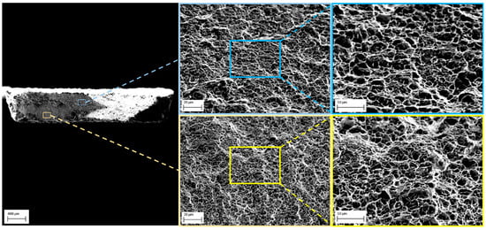 Post mortem SEM fractographic analysis showed that fracture surfaces of both Corroding and Annealed SSRT specimens were entirely dimpled. As an example, Figure 7 shows the fracture surface of a Corroding specimen exposed for the longest period of time used in the current work, i.e., 27 days. It should be noted that the change of the fracture mode from ductile to brittle, i.e., formation of quasi-cleavage fracture surfaces with flat facets, can be expected only after more severe hydrogen charging [9,11,17,19,30,49]. Liu and Atrens underlined that ductile dimple fracture can be observed in the presence of low amounts of hydrogen [50].