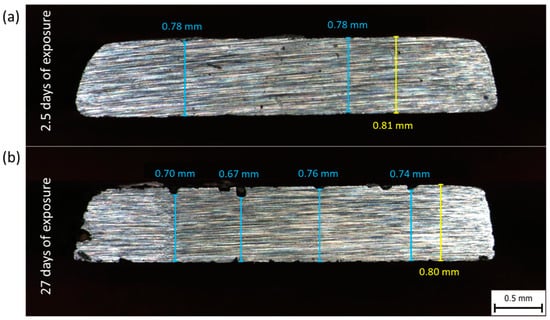 Photographs of cross section of the Corroding SSRT specimens with NaCl deposits and exposed in humid air at 85% RH for 2.5 days (a) and 27 days (b).