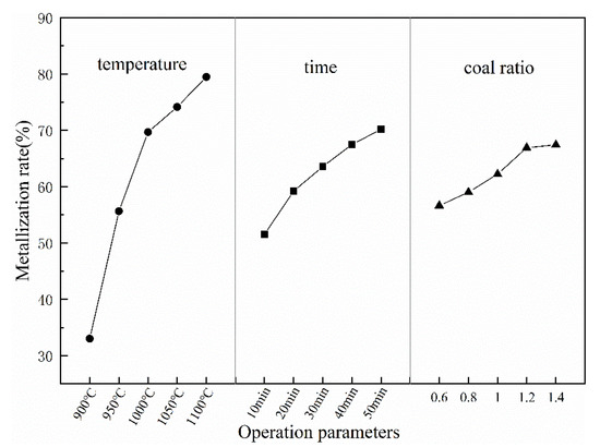 Figure 5a shows that the metallization rate was increased with the increase of temperature. The metallization was only 34.21% at 900 °C, which was far away from the aim of 70%. As the temperature rose to 950 °C, the metallization rate increased by 27.73% to 61.94%, which was almost twice the previous date at 900 °C. As the temperature rose to 1000 °C, the metallization rate increased by 10.63% and reached 72.57%, which exceeds the target value of 70%. As the temperature further increased, the increase of the metallization rate gradually decreased to about 5%. When the temperature rose to 1050 °C and 1100 °C, the metallization rates reached 78.18% and 83.42%, respectively. We can also see from Figure 5a that as the reduction temperature increased, the FeO content of the pellets gradually decreased. The results demonstrate that increasing the temperature is beneficial to the reduction of FeO to metallic iron. Previous research [31,32] shows that the working temperature of the rotary kiln should be 100–150 °C lower than the soft melting point of pulverized coal to avoid the ring formation of the rotary kiln. Therefore, according to Table 3, the working temperature in the rotary kiln should be lower than 1030 °C. Fully considering the metallization rate and the suppression of ring formation in the rotary kiln, the temperature of 1000 °C is the most reasonable parameter.