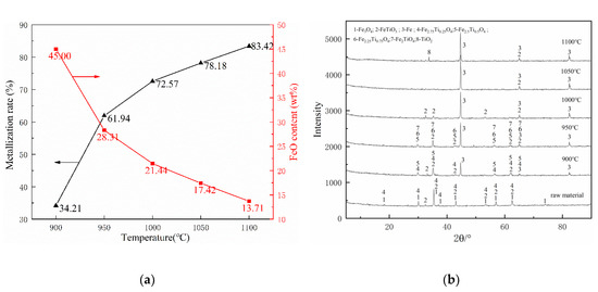 Effects of various reduction temperatures on composite’s behaviors: (a) metallization ratio and FeO content and (b) phase change.