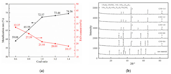 Effects of coal ratio on composite’s behaviors: (a) metallization ratio and FeO content and (b) phase change.