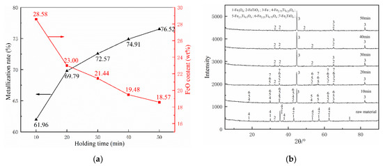 The effect of holding time on the main phase transformation during the reduction was investigated by XRD, as shown in Figure 7b. As the holding time reached 10 min, Fe3O4 was disappeared and Fe2.75Ti0.25O4 was partly reduced to Fe2.5Ti0.5O4 and Fe2.25Ti0.25O4. Accompany with the holding time increased, the remaining Fe2.75Ti0.25O4 was gradually disappeared, and traces of Fe2TiO4 were detected in the XRD pattern. When the holding time reached to 30 min, Fe2.5Ti0.5O4, Fe2.25Ti0.25O4, and Fe2TiO4 almost disappeared, and only left FeTiO3 and Fe. Subsequently, the phase composition of the samples remained unchanged and the Fe peak did not change significantly, which indicates that increasing the holding time after 30 min only has a little effect on the metallization rate.