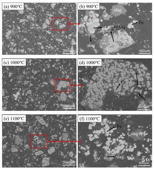 The microstructures of the reduced pellets in different reduction temperature are shown in Figure 8. The black area in the figures indicates the pores inside the pellet (it is caused by the use of synthetic resin filling during sample preparation). As the temperature increases, the pores inside the samples gradually increased from Figure 8a,c to Figure 8e. It is observed that Figure 8e has more pores than others. Besides, it can be seen from the comparison of Figure 8b,d,f, that as the temperature rises, the metallic iron gradually gathers together to form agglomerates, and the particles gradually become bigger and rounded. The Fe3-xTixO4 phase sandwiched between the Fe phase and the slag phase gradually disappeared. The FeTiO3 phase is surrounded and in close contact with the metal iron phase, making it more difficult to be reduced.