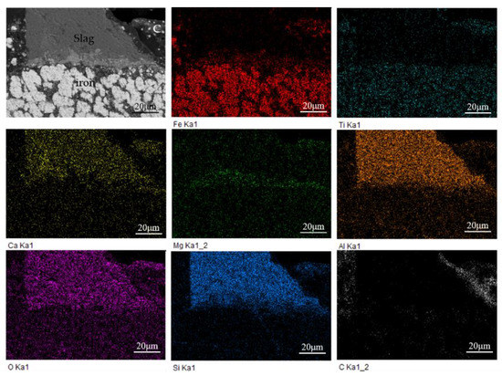 As shown in Figure 9, the main elements of the reduced sample include Fe, Ti, Ca, Mg, Al, O, Si, and C. It can be seen from that the iron phase is mainly separated from slag, but tightly combined with titanium. Combined with the previous XRD analysis, it can be known that the titanium element mainly exists in the form of ilmenite. The ilmenite is widely distributed near the newly produced metal iron and is surrounded by the slag phase on the periphery, making the iron in ilmenite difficult to be reduced by the residual carbon distributed in the outermost part.