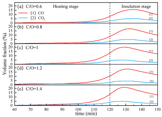 From Figure 11, we can see the effect of coal ratio on CO and CO2 contents in the off-gas. As the internal carbon content increases from 0.6 to 1, the peak of CO volume fraction increases from about 15% to about 20%. Continuing to increase the internal carbon content, the peaks of CO and CO2 did not increase and even dropped slightly at C/O = 1.2. This may be because the increase in internal carbon resulted in a decrease in VTM content, which reduced the total content of oxygen that could be taken away by carbon in the reduction reaction.