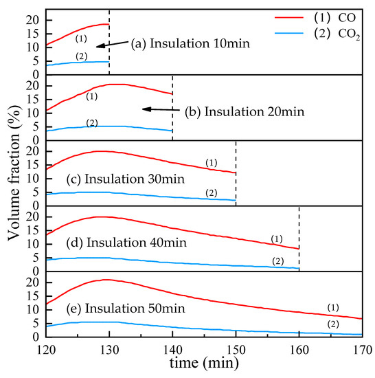 The influence of insulation time on the CO and CO2 contents in the off-gas.