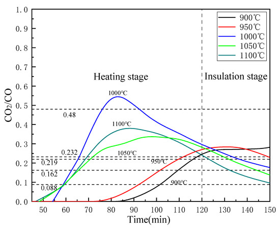 Reducing the value of CO2/CO is beneficial for the reduction of iron oxides, but as the value of CO2/CO decreases, a large amount of CO does not participate in the actual reaction, which will greatly reduce the utilization rate of CO. That is undesirable from the perspective of energy utilization. Therefore, according to the process requirements, selecting the appropriate temperature and reduction time is necessary for saving energy. Therefore, the reduction temperature of 1000 °C is a suitable choice for this process.