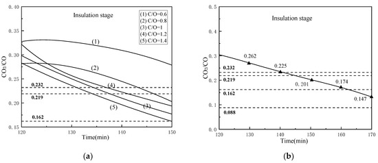 Changes of CO2/CO value under different conditions: (a) 1000 °C, 30 min and different coal ratios and (b) 1000 °C, C/O = 1 and different reduction holding time.