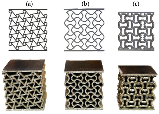 All samples were manufactured with a PBF method on the AM250 additive manufacturing device (Renishaw, Wotton-under-Edge, United Kingdom) from austenitic stainless steel alloy (SS 316L-0407) with the base material density = 7990 kg/m3 and the yield strength of 494 MPa (Figure 1). Powdered stainless steel 316L-0407 with granularity in the range of 15–45 μm was layered in 50 μm thick layers and melted with a laser beam with a maximal power of 200 W during the production process. The detailed composition of the material is given in Table 1. The dimensions of the samples (Table 2) were determined regarding geometric constraints of the impact testing apparatus. The specimens consisted of a minimum of five cells in a longitudinal and lateral direction to obtain appropriate RVE [23]. The relative density of the samples was determined as , where and represent bulk specimen density and density of the base material, respectively. Porosity p of the specimens was calculated as .