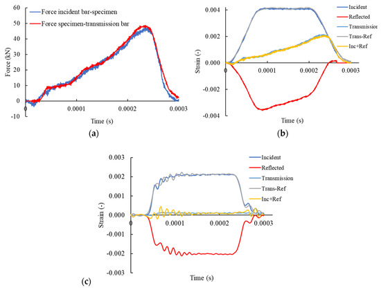 An example of (a) dynamic force equilibration, (b) strain equilibration with pulse shaper, and (c) strain equilibrium without pulse shaper.