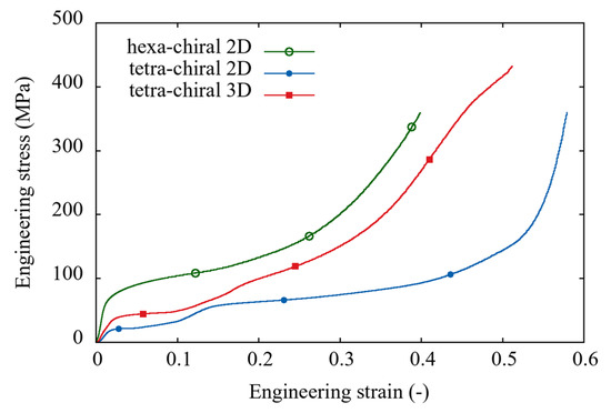 Average quasi-static compression stress-strain curves of hexa-chiral 2D, tetra-chiral 2D and tetra-chiral 3D structure.