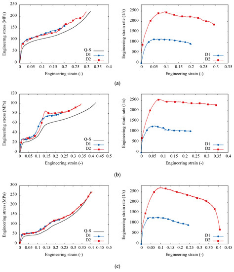 The average dynamic engineering stress-strain relationships compared to the quasi-static results together with average engineering strain-rates achieved during dynamic experiments are shown in Figure 6.