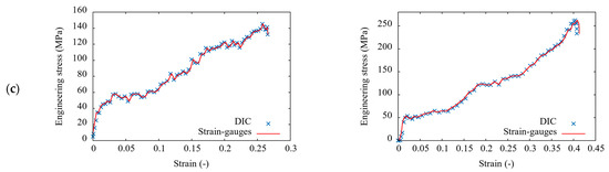 A comparison of DIC and measured results in terms of engineering stress-strain relationships at both impact velocities for all analysed structures are shown in Figure 8. The DIC strains were obtained at the edges of the specimen while the engineering stress values were always obtained from processing the strain-gauge measurements. The comparison shows an excellent agreement of DIC and measured results for all structures and striker’s impact velocities.