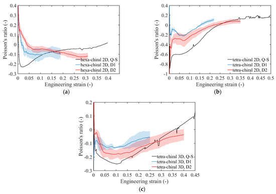 Average quasi-static Poisson’s ratio-strain relationships of hexa-chiral 2D, tetra-chiral 2D, and tetra-chiral 3D structure.