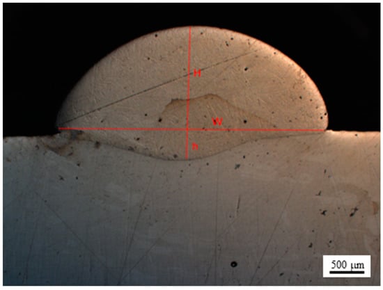 When the laser cladding parameters are unchanged, the dilution rate of single-layer single-pass laser cladding is the same as single-layer multi-pass laser cladding and multilayer multi-pass laser cladding. According to the laser cladding parameters in Table 2 (due to the single-layer single-pass cladding, the overlap rate parameter is not required here), the geometric dimensions of the single-layer single-pass laser cladding sample are shown in Figure 3. According to the literature, the dilution rate (λ) can be calculated by the area method [23], and the formula is simplified to:
