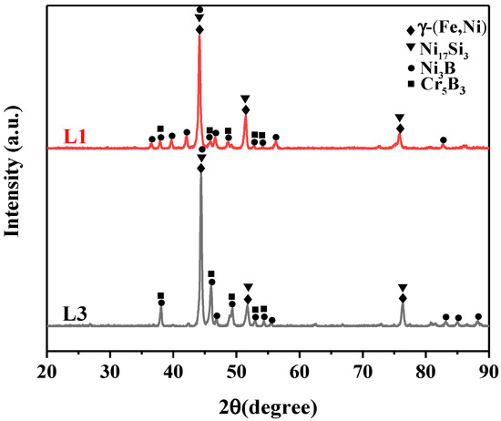 XRD patterns of coatings are shown in Figure 4. According to Table 1, the content of Fe in nickel-based alloy powder is very low, but face centered cubic structural γ-(Fe, Ni) phase has been detected in XRD. This is because the molten pool is formed on the substrate surface under the irradiation of laser beam, and interdiffusion occurs between the substrate and the nickel-based coating [24], making a large amount of Fe enter the coating. The radius of Fe atoms is very close to that of Ni atoms, and the rapid rise and decrease of temperature are similar to solid solution treatment. Thus γ-(Fe, Ni) solid solution appears on the coating surface of the single-layer cladding sample. However, during multilayer cladding, Fe is difficult to diffuse to the coating surface. Therefore, although the Fe-containing main dominant peaks are detected at 44° for both L1 and L3 samples, the phase content in L3 has changed, which can also be proved from the EDS results in Table 3. In addition, hard phases Cr5B3, Ni17Si3, and Ni3B have also been detected on the coating surface, which is proved to be helpful to improve the hardness and wear resistance of the coating [25,26,27,28,29].