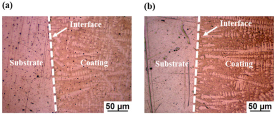 Figure 5 displays the metallographic diagram of the cross section of the nickel-based coating. It can be seen that the coating is well bonded with the substrate, and there are no obvious cracks. A lot of gas pores are observed in the coating of sample L1 (Figure 5a). During laser cladding, the temperature rises and decreases so rapidly that the gases have little time to escape, leaving them to remain in the coating and form pores. Moreover, these pores are randomly distributed and have nothing to do with the trajectory of the boundary, and the existence of pores will not affect the bonding quality between the substrate and the coating [30]. However, not many gas pores can be seen in the coating of sample L3 (Figure 5b), which is because the multilayer cladding will reheat the cladding area, greatly reducing the pores.