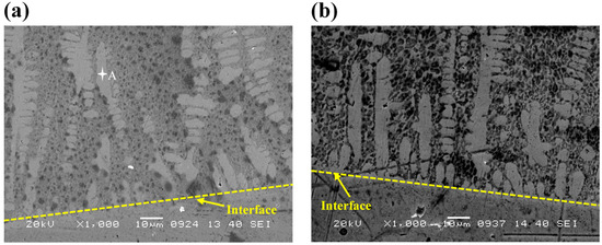 The SEM images of the cross section near the interface between coating and substrate are shown in Figure 6. According to Kou’s study [31], the ratio of G to R can be used to describe the change of microstructure, where G is the temperature gradient and R is the growth rate. It is well known that the ratio of G to R is high due to the good heat dissipation of the substrate and the short solidification time of the solution near the interface during the solidification of the coating. Thus, some cellular crystals appear along the boundary line. As shown in Figure 6a,b, with the decrease of the temperature gradient, an obvious columnar dendrite structure can be observed near the boundary line, and the columnar dendrite grows along the temperature gradient direction. According to the EDS data in Table 3, the main component of point A in Figure 6a is Ni, with a small amount of Si, Cr, and Fe, indicating that the composition of dendrite is γ-Ni phase and the binary eutectic γ-Ni formed by γ-Ni phase and other metal elements (Si, Cr, and Fe). Due to the high cooling rate, a dense eutectic phase was both observed between the γ-Ni dendrites in Figure 6a,b, which shows a network structure in sample L1 while a honeycomb texture in sample L3 due to multiple heating. Many dark regions can be seen between the eutectic phases. Paul believed that the main component of this region is borides [32], and the XRD results also verify the existence of borides. Therefore, the dendrite structure of eutectic is boride and binary eutectic γ-Ni. The microstructure near the coating-substrate interface is a uniform combination of columnar dendrites and interdendritic crystals.