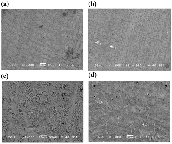 The SEM cross-section morphologies of the middle and surface areas of the coatings are shown in Figure 7. Due to the change of composition and the decrease of temperature gradient, the growth of columnar dendrites is limited. Thus, columnar dendrites are not observed in the middle of the coating, while uniformly arranged equiaxed dendrites appear instead. Meanwhile, the network eutectic structure between equiaxed dendrites becomes uniform due to the decrease of temperature gradient. Figure 7b is the SEM picture of the single-layer cladding coating surface and both columnar dendrites and steering dendrites can be observed. Due to the change of temperature gradient caused by the co-effect of the contact between the coating surface and air and the movement of laser beam [33], not only the columnar dendrites growth along the temperature gradient appear, but also the steering dendrites grow along the scanning direction on the coating surface occur. When the coating surface contacts the air, the cooling rate will be faster, and the grain growth will be limited. Thus it can be seen that the grain size in Figure 7b is significantly smaller than that in Figure 7a. In addition, more Fe elements have been detected in B1 and B2 in Figure 7b, indicating that single-layer cladding is more conducive to the diffusion of Fe elements to the coating surface so as to form γ-(Fe, Ni) lamellar eutectic with Ni [4]. Figure 7c is the SEM picture of the middle area of the multilayer cladding. When the second cladding layer solidifies, although the first cladding layer has solidified, it still has a certain amount of heat, resulting in heat accumulation. Due to the accumulation of heat, the value of G/R is not high enough to form planar crystal and cellular crystal, but columnar dendrite appears directly in Figure 7c. At the same time, the effect of heat accumulation increases the reheating area, and the solidification rate of grains decreases, resulting in larger columnar dendrite size [34]. On the other hand, heat accumulation reduces the effect of temperature gradient on the grain growth direction, making the columnar dendrites present different directions. From Figure 7d, it’s hard to find obvious dendrites. This is because when it is near the top of the molten pool, the solidification rate of the molten pool increases rapidly due to the contact with air, so that the dendrites cannot grow sufficiently. Moreover, a large number of fine particles appear in Figure 7d and Mohamad et al. [35] believed that the particles not completely melted on the surface of the cladding layer would play the role of heterogeneous nucleation points. As the EDS data in Table 3 show, the main components of the points D1, D2, and D3 are Ni17Si3, indicating that the large number of Ni17Si3 distributed on the coating surface during coating solidification help with the formation of a finer surface structure of the coating.