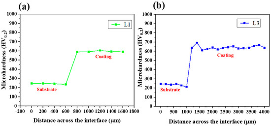 Microhardness profile of laser cladded cross section: (a) L1, (b) L3.